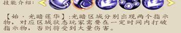 注:此技能其实就是BOSS攻击类别,分阴阳,也就是光明与黑暗。黑暗为主攻击伤害系。攻击效果是光明与黑暗同时出现,玩家躲避到白色【光明】光圈里时是安全的。在黑暗区域会损失一定血量。