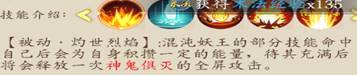 注:这个技能可以说不算是BOSS技能,说是福利更贴切一点,场地中会刷新4-5个小魔兵,玩家击杀后会有个光团,可以吃掉的,吃完后会有个额外的技能【如上图显示】,技能图片解释的比较模糊,直白一点,在BOSS飞天落地后,此技能才可对BOSS释放,削弱BOSS热量值,三层意思,1.削弱BOSS技能一所获得能量值。2.降低玩家所受技能伤害。3.降低灼伤状态的增幅。